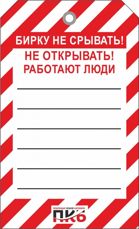 Информационная бирка "Не открывать, работают люди" арт. PKBS83, для одноразового использования, односторонняя. Изготовлена из пластика, толщиной 0,3 мм, оснащена металлическим люверсом Ø 8 мм . По желании заказчика толщина бирки может быть увеличена до 1-2 мм. Нанесение текста можно производить маркером или ручкой. Размер 70 х 115 х 0,3мм.