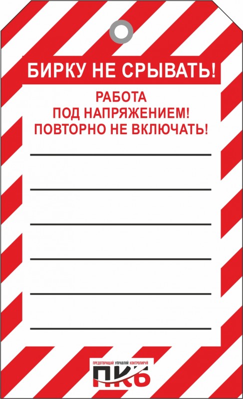 Информационная бирка "Работа под напряжением", арт. PKBS84, для одноразового использования, односторонняя. Изготовлена из пластика, толщиной 0,3 мм, оснащена металлическим люверсом Ø 8 мм . По желании заказчика толщина бирки может быть увеличена до 1-2 мм. Нанесение текста можно производить маркером или ручкой. Размер 70 х 115 х 0,3мм.